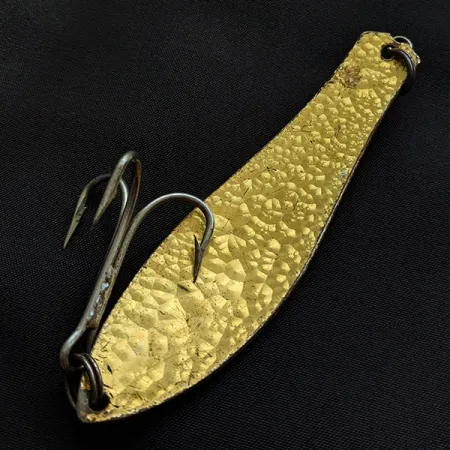 Gehamerde kristalstructuren over de goudkleurige voorzijde zorgen voor de kenmerkende afwerking van deze Prescott Spinner creatie. Met een lengte van 9 cm en een gewicht van 19 g toont deze Little Doctor 275 Crystal (artikelcode 21830) de afwerkingsstijlen die typerend zijn voor vintage Amerikaanse lepels. Een duidelijk leesbare "DOCTOR" stempel bevindt zich op de achterzijde, net boven drie kleine rode stippen bij het bevestigingspunt van de wartel. De zilverkleurige dreg is stevig bevestigd aan de brede achterzijde met een heavy-duty splitring. Wat de staat betreft, verkeert het kunstaas in conditie 4/5, met een schoon oppervlak en een duidelijke textuur op beide zijden van het metalen lichaam.