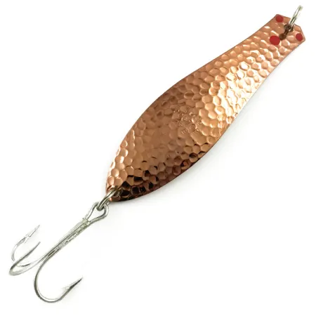 Gehamerde koperen afwerkingen zoals op dit exemplaar zijn ontworpen om licht in verschillende richtingen te vangen en te reflecteren, een techniek waar de Amerikaanse fabrikant Prescott Spinner al lang om bekend staat. Met een gewicht van 17 g (3/5 oz) heeft de Little Doctor 275 Lite (Code 6030) een opvallend gehamerd oppervlak op de bolle zijde, wat contrasteert met het gladde, gepolijste koper aan de achterkant. Twee kleine rode kleuraccenten bevinden zich bij het bovenste bevestigingsoog en vormen een subtiel focuspunt tegen de warme metaalkleur. Met een lengte van 9 cm (3 1/2") is de lepel uitgerust met een sterke zilverkleurige dreg, bevestigd met een heavy-duty splitring. De stempels van de fabrikant zijn duidelijk zichtbaar in het metaal en bevestigen de USA herkomst. Dit exemplaar verkeert in uitstekende staat (5/5 score) met schoon beslag en een heldere glans. De dikke haak en de massieve metalen uitvoering maken dit een kunstaas dat gebouwd is voor werpen en trollen waarbij duurzaamheid voorop staat.