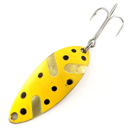 Met een gewicht van 1/2 oz (14 g) heeft deze vintage lepel de solide constructie die kenmerkend is voor de Luhr Jensen 11366-serie. Een levendige gele afwerking bedekt de voorkant, geaccentueerd door zwarte stippen en bewuste messing uitsnijdingen die een gelaagd visueel effect creëren. De achterkant is voorzien van een scherpe stempel "LITTLE JEWEL BY LUHR JENSEN" samen met het klassieke ruitmerk van het bedrijf, wat de oorsprong als een in de VS gemaakt, uit productie genomen exemplaar bevestigt. Met een lengte van 2 1/4" (5,5 cm) heeft dit exemplaar een conditiescore van 4/5, met lichte gebruikssporen die de geschiedenis eren zonder afbreuk te doen aan de algehele presentatie. Een stevige zilverkleurige dreg is aan de staart bevestigd, wat de constructie van dit klassieke werp- en trolaas compleet maakt.