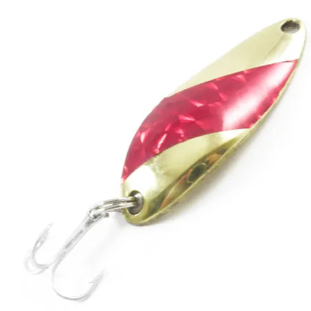 Deze lepel is duidelijk ingestanst met de branding "Little Jewel" en Luhr Jensen USA op de holle achterzijde en vertegenwoordigt een klassiek tijdperk van Amerikaanse hengelsportproductie. De voorkant heeft een opvallende Goud / Rood afwerking, waarbij een levendig, gefacetteerd rood diamantpatroon contrasteert met het gepolijste gouden metaal. Met een afmeting van 4,7 cm (1 3/4") en een gewicht van 9 g (1/3 oz), wordt deze zeldzame vintage schat geïdentificeerd door productcode 3174. Hij is uitgerust met een stevige splitring en een scherpe dreg, gebouwd voor werpen of slepend vissen. De algemene staat wordt beoordeeld als 5/5, met een zeer goed bewaard gebleven oppervlak dat de kwaliteit van de oude productiemethoden van Luhr Jensen benadrukt voordat het model uit het assortiment werd gehaald.