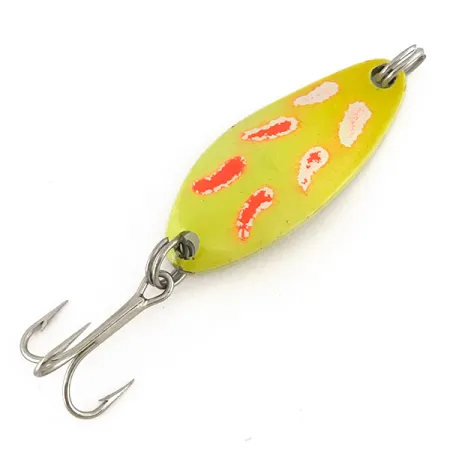 Met een lengte van precies 4 cm (1 1/2") vertoont het gestanste metalen lichaam van dit vintage kunstaas een klassieke gele basis met druppelvormige rode en witte fluorescerende patronen. De Little Jewel, met productcode 7519, is een legendarisch model uit de Amerikaanse productieperiode van Luhr Jensen dat al vele jaren uit de catalogus is verdwenen. Dit specifieke exemplaar van 7 g (1/4 oz) is voorzien van een gespecialiseerde UV Glow-afwerking, die zeer goed zichtbaar wordt in omgevingen met weinig licht, zoals te zien is op de secundaire afbeeldingen. De hardware omvat een dreg in originele stijl die is bevestigd met roestvrijstalen splitringen, waardoor de historische integriteit van het kunstaas behouden blijft. De conditie is beoordeeld als 4/5, met de levendige verf en duidelijke markeringen die verzamelaars associëren met Luhr Jensen-materiaal uit het midden van de vorige eeuw. De fluorescerende eigenschappen zijn specifiek ontwikkelt voor zichtbaarheid in diep of troebel water waar natuurlijk licht beperkt is.