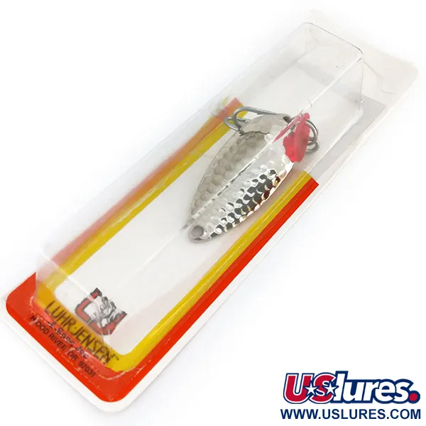 De diepe textuur van de gehamerde nikkelen body zorgt voor een hoog reflectieprofiel voor deze 14g (1/2oz) lepel. Deze ongebruikte Luhr Jensen Little Jewel zit nog in de originele blisterverpakking met de klassieke rood-gele graphics uit het Hood River, Oregon tijdperk. Een klein rood plastic attractietabje is gemonteerd aan de achterste splitring naast de dreg voor een visueel contrastpunt. Met een lengte van 5,5 cm (2 1/4") wordt het kunstaas geïdentificeerd door productcode 9673 en een SKU van 1233-999-0101 op de achterzijde van de kaart. De achterkant van de verpakking toont ook een productiedatum van 2005 en tweetalige instructies, wat het Noord-Amerikaanse erfgoed van dit vintage materiaal benadrukt.
