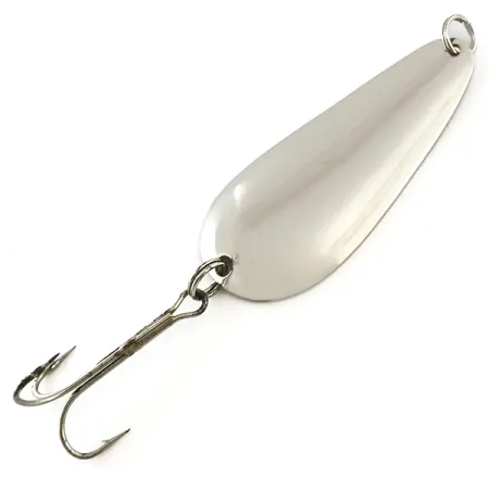Een volledige vernikkeling bedekt het oppervlak van deze 7,5 cm (3") lepel, wat zorgt voor een hoogglanzende afwerking waar vissers al decennia op vertrouwen. Met een gewicht van 17 g (3/5 oz) is het metalen lichaam substantieel genoeg voor verre worpen of trollen waarbij een krachtig profiel vereist is. De holle zijde is voorzien van een duidelijke stempel van de merknaam, een kenmerk van de Lindy / Little Joe traditie van betrouwbaar Amerikaans hengelsportmateriaal uit de VS. Dit specifieke exemplaar, gecatalogiseerd onder productcode 6287, verkeert in 5/5 conditie en toont de heldere, ongeschonden glans van een perfect bewaard gebleven kunstaas. De montage is eveneens schoon, met een sterke dreg en splitringen die gebouwd zijn voor ruig gebruik in diverse zoetwateromgevingen. De gestroomlijnde, langwerpige druppelvorm is een klassiek ontwerp dat is ontwikkeld om licht uit meerdere hoeken op te vangen, zelfs in diepere of troebele omstandigheden.