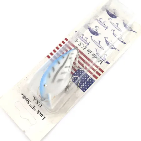 Blauwe schubben accentueren het witte lichaam van deze drijvende crankbait van 5 cm, een vintage exemplaar met een gewicht van 7 gram. Gecatalogiseerd onder productcode 21356, is dit kunstaas ongebruikt gebleven in de originele verpakking die met een opvallend vlagontwerp de Amerikaanse herkomst benadrukt. De bouw is specifiek afgestemd op gebruik in ondiep water, met een duikdiepte van 0,3 tot 0,9 meter. Deze plug is geschikt voor zowel werpen als trollen en werd historisch aanbevolen voor de visserij op roofblei, baars en snoek. De achterzijde van de verpakking biedt een blik op de bedrijfsgeschiedenis, met vermelding van de Luck “E” Strike USA P.O. Box in Cassville, MO, en distributie door Ken International inc. De afwerking van dit exemplaar is onberispelijk, met behoud van de kenmerkende ribbelmarkeringen op de flanken en de helderwitte kleur op de buik.