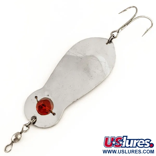 Een gefacetteerde rode glazen kraal dient als opvallend middelpunt nabij het bevestigingsoog van deze in Canada gemaakte Lucky Strike lepel. Duidelijk gestempeld op de achterzijde met het merk van de fabrikant, vertegenwoordigt dit exemplaar de klassieke verzilverde afwerking die een vaste waarde werd in Noord-Amerikaanse tackleboxen. Met een gewicht van 25 g (1 oz) en een lengte van 8,5 cm (3 1/4"), biedt het aanzienlijke massa voor werpen of trollen. Dit specifieke exemplaar, geïdentificeerd met productcode 12653, verkeert in conditie 4/5 en behoudt een helder en reflecterend oppervlak. Een interessante modificatie is te vinden aan de haak: één punt van de originele dreg is opzettelijk afgeknipt om er een dubbele haak van te maken, waarschijnlijk om beter door planten of rotsachtige structuren te vissen.