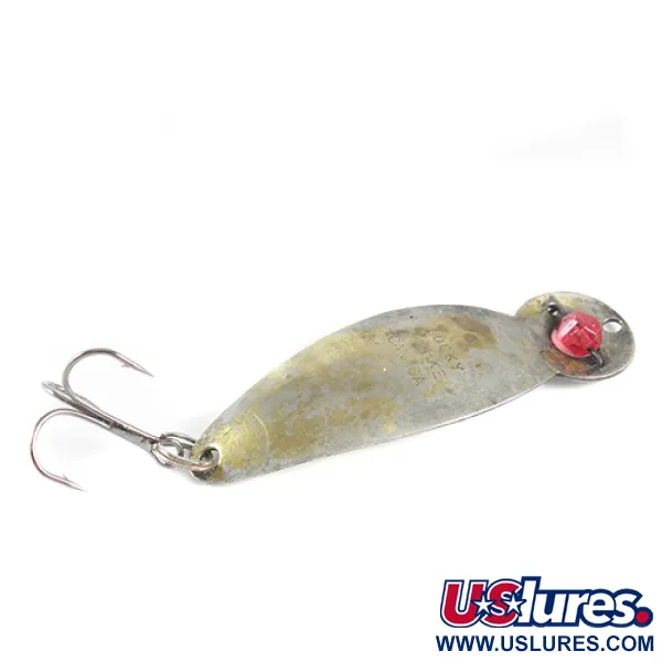 Met het stempel "LUCKY STRIKE CANADA" duidelijk op de achterzijde, toont deze vintage metalen lepel het klassieke vakmanschap van een legendarische Noord-Amerikaanse hengelsportfabrikant. Een gefacetteerde rode glaskraal is stevig in de kop van het kunstaas gemonteerd en zorgt voor een visueel middelpunt met hoog contrast. Met een lengte van 7 cm en een gewicht van 12 g, is het lichaam voorzien van een verzilverde / vergulde afwerking waarbij het tweekleurige metaal zichtbaar is over het gebogen profiel. De druppelvorm gaat over in een cirkelvormig bovendeel waar de lijnoog en de kenmerkende rode kraal zich bevinden. Geïdentificeerd door productcode 1527, heeft dit exemplaar een conditie van 4/5, met eerlijke ouderdomssporen terwijl de functionele integriteit behouden is gebleven. De montage bevat een stevige dreg bevestigd via een splitring aan de staart, klaar voor werpen of trollen.