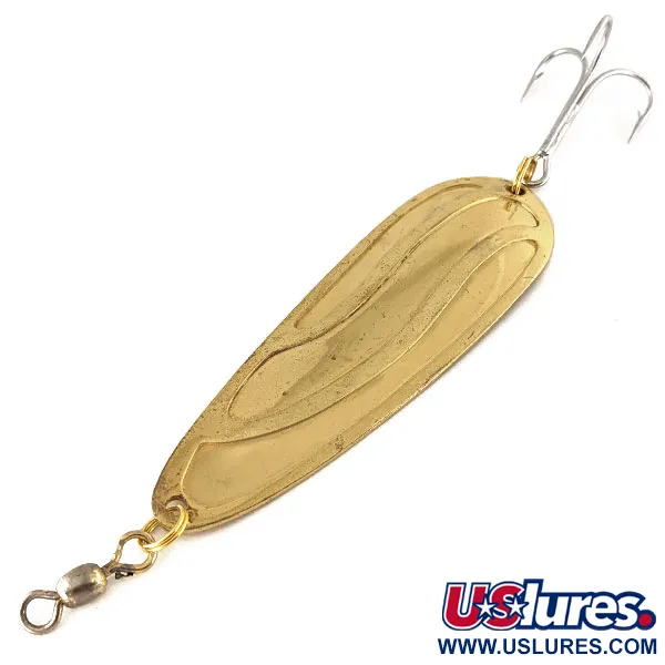 Deze goudkleurige metalen lepel met een lengte van 9 cm (3 1/2") staat voor het duurzame vakmanschap dat synoniem is aan het in Canada gemaakte Lucky Strike visgerei. Het zware lichaam van 28 g (1 oz) is voorzien van een kenmerkende golvende textuur die in het metaal is geperst, bedoeld om licht vanuit verschillende hoeken op te vangen en te reflecteren onder water. Het kunstaas, bekend onder productcode 12479, is uitgerust met een robuuste zilverkleurige dreg en een tonwartel die met splitringen aan beide uiteinden zijn bevestigd voor een betrouwbare verbinding. De holle binnenzijde is gestempeld met het merk van de fabrikant, wat de identiteit van dit vintage exemplaar bewaart. Met een score van 5/5 blijft de vergulding over het gehele oppervlak uitzonderlijk glanzend, wat getuigt van de hoogwaardige afwerking van het merk.