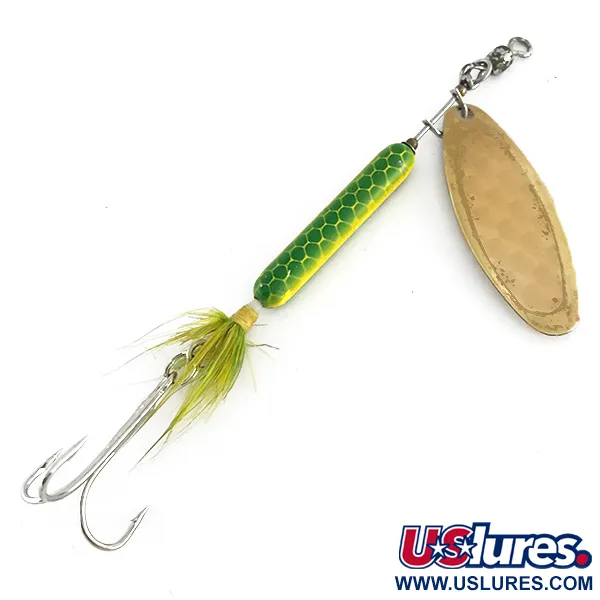 Gouden afwerkingen op het wilgenblad kenmerken deze vintage vondst, met een duidelijke "BANG TAIL 6" stempel op het messingkleurige oppervlak. De Luhr Jensen Bang Tail, bekend onder productcode 8411, heeft een opvallend honingraatschubbenpatroon op het cilindrische lichaam, waarbij bosgroen wordt gecombineerd met een heldergele buik. Met een gewicht van 17 g (3/5 oz) is de spinner gebouwd op een stevig draadframe dat kenmerkend is voor in de USA gemaakte uitrusting uit die tijd. De staart is uitgerust met een dreg die is afgewerkt met een mix van gele en groene vezels, wat zorgt voor een getextureerd achtervolgend element. Dit exemplaar is zeer goed onderhouden, wat een conditiescore van 4/5 rechtvaardigt. Een gehamerde textuur aan de binnenkant van het blad zorgt voor een subtiel visueel detail dat licht vangt terwijl het blad roteert tijdens een gelijkmatige inhaalbeweging.