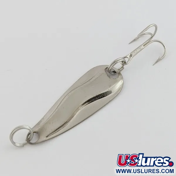 Duidelijk gestempeld met HOT SHOT W op de achterzijde, het lichaam van het kunstaas heeft een kenmerkend drievoudig gecontureerd golfprofiel dat het onderscheidt van traditionele platte lepels. Dit exemplaar van Luhr Jensen is afgewerkt in hoogglans nikkel, meet 3 cm (1 1/4") en weegt een subtiele 1,3 g (3/64 oz). De hardware bestaat uit een in de fabriek gemonteerde dreg en splitringen aan zowel de kop als de staart voor veelzijdige montagemogelijkheden. Ontworpen voor technisch werpend vissen of licht trollen in zoet water, is dit model een gespecialiseerd gereedschap voor forel- en steelheadvissers met licht materiaal. Het metalen oppervlak verkeert in uitstekende staat (score 5/5) en vertoont een heldere, reflecterende glans over de gehele vorm. De technische specificaties voor dit stuk zijn vastgelegd onder productcode 24441.