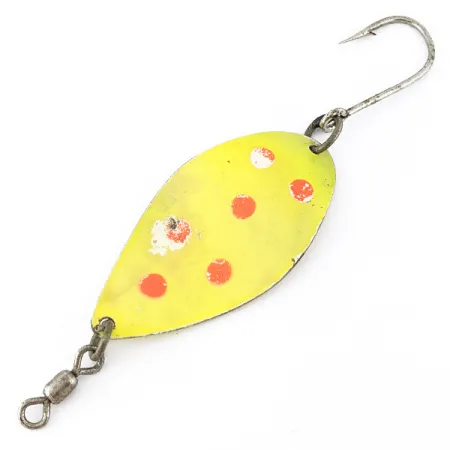 Afgewerkt met een levendige gele basis en een reeks handgeschilderde rode en witte stippen, weerspiegelt de afwerking van deze Luhr Jensen Manistee 4 zijn geschiedenis op het water. Met een gewicht van 1/2oz (14g) zijn het gebogen profiel en de zware constructie van de lepel door de Amerikaanse fabrikant ontworpen voor de jacht op zalm en forel. Dit specifieke exemplaar, geregistreerd onder productcode 22595, toont een eerlijk karakter waar de verf is weggesleten door vorig gebruik, wat het een solide 4/5 conditiescore oplevert. De componenten blijven betrouwbaar, voorzien van een enkele, wijdgaapende haak en een stevige tonwartel verbonden via splitringen. De Manistee-serie vindt zijn oorsprong in de VS en is al lang een favoriet vanwege de duurzame constructie en de klassieke druppelvorm van het metalen blad. Het rood-op-geel patroon is een traditionele keuze die opvalt in verschillende waterhelderheden, wat het vakmanschap benadrukt waar Luhr Jensen om bekend staat.