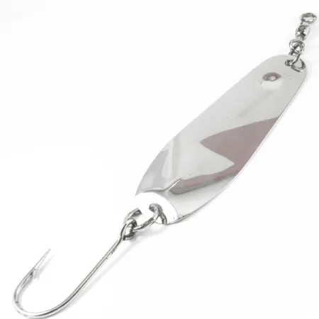 Gepolijst nikkel zorgt voor een hoogglans afwerking op deze 14g (1/2oz) metalen lepel. Geproduceerd door Luhr Jensen in de VS onder productcode 3341, blijft het McMahon-model een klassieke keuze voor gespecialiseerde troll-opstellingen. Met een lengte van 10cm (4") heeft het kunstaas een slank, langwerpig profiel dat is ontworpen voor stabiliteit bij het slepen achter een boot. De hardware bestaat uit een tonwartel aan de neus om kinken in de lijn te beperken en een grote enkele haak die is bevestigd via een robuuste splitring aan de achterzijde. Dit specifieke exemplaar verkeert in 5/5 conditie en behoudt zijn spiegelachtige reflecterende oppervlak zonder krassen of slijtage. Luhr Jensen vestigde zijn reputatie met deze gestanste metalen ontwerpen, die eenvoudige fysica gebruiken om licht te vangen en de aandacht van vissen te trekken in verschillende waterhelderheden.