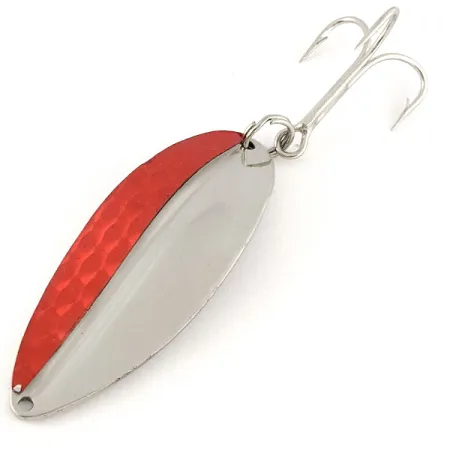 Een gehamerde textuur bedekt precies de helft van het blad van deze 21 g lepel, wat zorgt voor een visueel contrastrijk profiel. Dit 6,5 cm lange kunstaas, bekend als de Main Liner van TODDCO met productcode 21487, vertegenwoordigt de Amerikaanse hengelsportindustrie uit het tijdperk van vóór 1980. Het kleurenschema is een opvallende verdeling tussen gepolijst nikkel en dieprood, waarbij de rode zijde is voorzien van een gehamerd oppervlak dat fysieke diepte aan het metaal geeft. Het is uitgerust met een scherpe dreg en een robuuste splitring, terwijl een enkel geponst gat in de neus dient als bevestigingspunt voor de lijn. Dit specifieke exemplaar verkeert in een uitzonderlijk schone staat, wat een conditiescore van 5/5 oplevert. De gestanste metalen constructie is uitgebalanceerd voor veelzijdig gebruik bij zowel werpen als trollen.