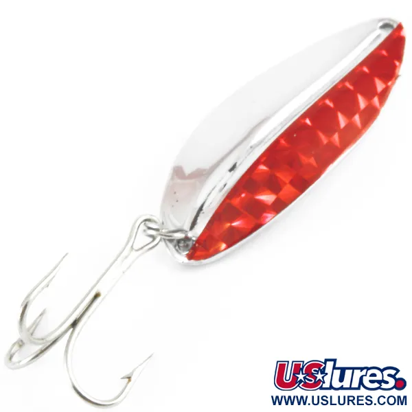 Met een gewicht van 12,5 g (2/5 oz) toont deze vintage Amerikaanse lepel het vakmanschap van TODDCO, een fabrikant die rond 1980 zijn productie in de VS beëindigde. Een levendige, diamantvormige rode inleg zorgt voor een scherp visueel contrast met het hoogglans gepolijste nikkelen lichaam, dat 5,5 cm (2 1/4") lang is. Deze Main liner, herkend aan productcode 3671, heeft een klassiek druppelvormig silhouet met een strakke, holle achterzijde en één bevestigingsoog aan het smalle uiteinde. De hardware bestaat uit een zilverkleurige dreg bevestigd met een splitring. Dit exemplaar verkeert in 5/5 conditie, met een goed bewaard gebleven metalen afwerking en stevig bevestigde prismatische rode tape.