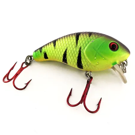 Fire Tiger-patronen zoals op dit 6 cm (2 1/4") lange lichaam blijven een essentieel onderdeel voor omstandigheden met veel zichtbaarheid waar een opvallende presentatie nodig is. Met een gewicht van 7 g (1/4 oz) is dit exemplaar van de Mann's Bait Company een gespecialiseerde shallow-runner, ontworpen om tijdens het binnenvissen binnen 0,3 m (1 ft) van de oppervlakte te blijven. Gelabeld met productcode 11738, is dit kunstaas voorzien van een kenmerkende heldere plastic squarebill-duiklip en een drijvend lichaam. De afwerking is in 5/5 conditie, met een felle chartreuse flank die overgaat in een donkerpaarse rug, gemarkeerd met dikke zwarte verticale strepen. Rode dreg-haken zijn bevestigd via stevige splitringen, wat een scherp contrast vormt met het beslag op de buik. Deze in de USA gemaakte Baby 1-Minus is voorzien van opvallende rode ogen en een gedetailleerde schubtextuur op het bovenlichaam. Het is een goed bewaard gebleven voorbeeld van de small-frame crankbaits die de reputatie van de in Alabama gevestigde fabrikant op het gebied van oppervlakte-georiënteerde presentaties hebben gevestigd.