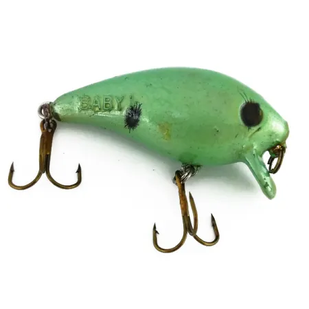 Een gewicht van 1/4 oz (7 g) geeft deze shallow-runner de massa die nodig is voor nauwkeurige worpen in dichte dekking. Met een lengte van 2 1/4" (6 cm) is het kunstaas voorzien van een parelmoerachtige Green / Black afwerking en het herkenbare "BABY" reliëfstempel op de flank. Mann's Bait heeft dit model ontworpen om in de bovenste waterlaag te blijven, met een maximale diepte van slechts 0,3 m (1 ft). Het ontwerp bevat een uniek oogpatroon met fijne radiale lijnen en een enkele zwarte stip op de zijkant, typisch voor vintage producties uit de USA. Alle originele hardware is aanwezig, inclusief twee stevige dreggen en een splitring, wat dit item een conditiescore van 5/5 oplevert. Productcode 9711 is gegoten met een korte, steile duiklip die de duikdiepte beperkt terwijl de drijvende eigenschappen behouden blijven.