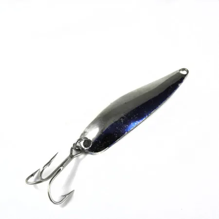 Met een licht gewicht van 8g (1/4oz) toont het slanke lichaam van deze in Amerika gemaakte lepel een kenmerkende tweekleurige esthetiek. De ene helft van de bolle zijde is afgewerkt met helder, gepolijst nikkel, terwijl de andere zijde is gecoat met een diepblauwe metallic lak met fijne glitteraccenten. Duidelijk gestempeld op de achterkant zijn de naam Marathon en de herkomst USA, kenmerken van de fabricage van visgerei uit het midden van de eeuw. Met een lengte van 6cm (2 1/4") bestaat de hardware uit een klassieke dreg verbonden door een betrouwbare splitring. De conditie is een solide 4/5, met een schoon oppervlak en scherpe haakpunten, wat duidt op zorgvuldige opslag door de jaren heen. Dit specifieke 0387-model is een basisproduct voor degenen die vissen op forel of baarsachtigen waarbij een kleiner profiel vereist is.