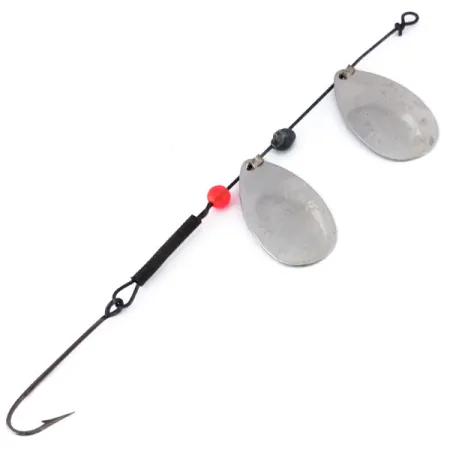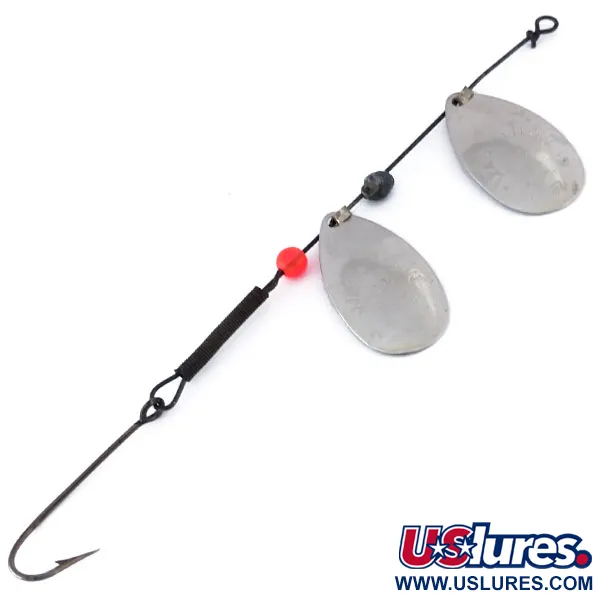 Een vernikkeling bedekt de tandembladen van deze 12,0 cm (4 3/4") spinner rig, wat zorgt voor een heldere schittering in verschillende wateromstandigheden. Met een gewicht van 3,4 g (1/8 oz) is het kunstaas gebouwd op een donkere metalen as en voorzien van een enkele rode kraal die dient als aanbijtpunt tussen het onderste blad en de haak. De tandemconfiguratie maakt gebruik van twee druppelvormige bladen om het oppervlak te maximaliseren, terwijl een slank profiel behouden blijft voor werpen of trollen. Een enkele haak met een scherpe punt is aan de achterzijde bevestigd, versterkt met een zwarte huls voor stabiliteit. Dit Marathon-kunstaas met productcode 10143 is vervaardigd in de VS met een focus op duurzaamheid. De conditie wordt beoordeeld op 4/5, met een goed geconserveerde metalen afwerking en schoon ijzerwerk. Een eenvoudige draadoog aan de voorzijde maakt een directe knoop of het gebruik van een kleine speld mogelijk.