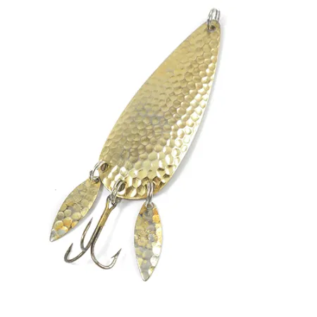 Een gehamerde goudtextuur kenmerkt het druppelvormige lichaam van deze vintage Amerikaanse lepel. Voorzien van twee kleine "Sonic Blades" bevestigd aan de staart naast de dreg, biedt deze Marathon 2 (productcode 2080) een complex profiel voor werpen of trollen. De firma Marathon uit de USA bouwde deze lepels op een massief messing basis, zichtbaar op de gladde achterzijde. Met een gewicht van 14g (1/2oz) en een lengte van 7cm (2 3/4"), behoudt het kunstaas een glanzende, reflecterende afwerking op het gedeukte oppervlak. Het beslag blijft stevig, inclusief de splitringen die de extra bladen vasthouden. Dit exemplaar verkeert in 4/5 conditie, met zeer lichte oppervlakkige slijtage en kleine opslagsporen.