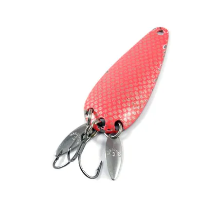 De getextureerde rode afwerking met schubpatroon op deze lepel biedt een contrastrijke look tegen de gepolijste nikkelen achterkant. Geproduceerd door de Marathon Bait Company uit Wisconsin, die actief was tussen 1929 en 1979, toont dit exemplaar van 6 cm (2 1/4") onder productcode 3002 de innovatieve aanpak van het merk. Met een gewicht van 12 g (2/5 oz) is het vernikkelde lichaam uniek uitgerust met twee kleine, langwerpige sonische bladen die naast de dreg aan de splitringen zijn bevestigd. Deze zilveren bladen zijn zo geplaatst dat ze licht reflecteren, waardoor de haakpunt effectief wordt verbloemd terwijl de flikkering van de staartvin van een aasvis wordt nagebootst. Het kunstaas verkeert in een 4/5 conditie en vertoont lichte gebruikssporen die de historische aantrekkingskracht behouden. Duidelijke "Marathon" stempels zijn aanwezig op de achterkant van de lepel en op de afzonderlijke sonische bladen.