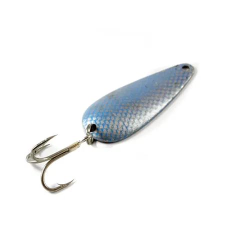 Een opvallende blauwe en nikkelen schubbenafwerking bedekt de bolle kant van deze 6 cm (2 1/4") lepel, wat zorgt voor een gestructureerde look die decennialang een vast onderdeel was voor vissers in Wisconsin. De stempel op de nikkelen achterzijde identificeert dit als een echte Marathon, geproduceerd door de Marathon Bait Company die tussen 1929 en 1979 kunstaas vervaardigde in de USA. Met een gewicht van 9 g (1/3 oz) behoudt de lepel zijn originele dreg en draagt deze productcode 3015. De 4/5 conditie wordt gekenmerkt door lichte oppervlakteslijtage die het glanzende nikkelen lichaam onder de blauwe schubbenverf onthult, waardoor het vintage karakter intact blijft terwijl het metaal zelf schoon blijft. De gestempelde belettering op de achterkant blijft scherp en vormt een duidelijke link naar de lange geschiedenis van hengelsportproductie van het bedrijf in het Amerikaanse Midwesten.