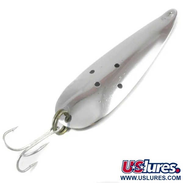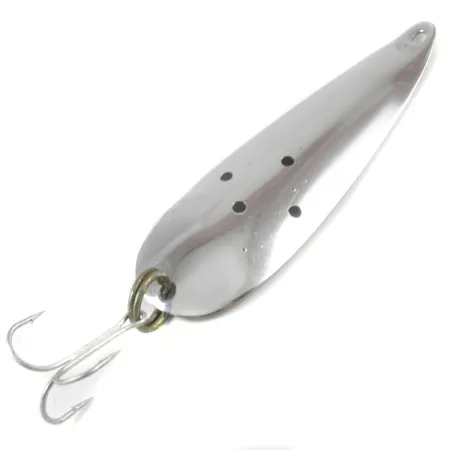 Een gepolijste nikkelafwerking zorgt voor een sterk reflecterend oppervlak op deze vintage metalen lepel, ontworpen voor het werpen in diep water of trollen. Met een gewicht van 18 g (2/3 oz) en een lengte van 9,5 cm (3 3/4"), heeft het lichaam vier specifieke perforaties in het midden, een unieke technische keuze van de Marathon Bait Company. Deze in Wisconsin gevestigde fabrikant was actief van 1929 tot 1979, en dit specifieke exemplaar, geregistreerd onder productcode 3224, weerspiegelt de robuuste Amerikaanse productie van die tijd. De hardware bestaat uit een stevige splitring en een glanzende dreg, die allemaal in 5/5 conditie verkeren. Het stempel van de fabrikant is duidelijk zichtbaar op de holle zijde van het kunstaas, wat de erfgoedwaarde bevestigt voor verzamelaars van visgereedschap uit het midden van de eeuw.