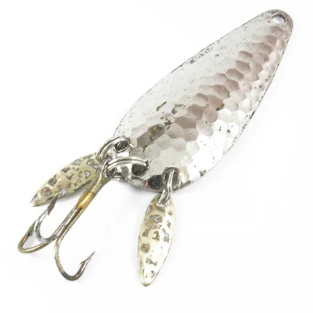 Gehamerde nikkeltexturen vangen het licht over het brede oppervlak van een klassieke lepel van de Marathon Bait Company. Dit in Wisconsin gemaakte kunstaas, geïdentificeerd door code 3480, heeft een lengte van 6 cm (2 1/4") en weegt 12 g (2/5 oz). Een opvallend kenmerk van dit model is de toevoeging van twee kleine 'sonic' bladen die aan de onderste splitringen zijn bevestigd. Deze mini-bladen zorgen voor extra schittering en bootsen de beweging van een staartvin na, terwijl ze de scherpe dreg helpen verbergen. Op de gladde achterzijde staat duidelijk de naam 'MARATHON' gestanst, een handelsmerk van het bedrijf dat van 1929 tot 1979 in de VS actief was. De gehamerde afwerking op de bolle zijde zorgt voor een veelzijdig reflecterend oppervlak tijdens het werpen. Dit exemplaar heeft een conditiescore van 4/5, met goed bewaard gebleven hardware en een schone afwerking.