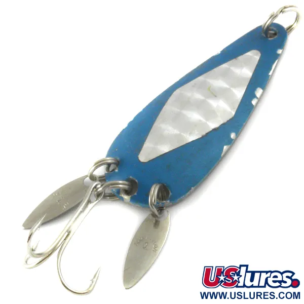 Een nikkel en blauwe afwerking bepaalt het visuele karakter van deze 6 cm (2 1/4") werplepel van de Marathon Bait Company. Marathon, gevestigd in Wisconsin tussen 1929 en 1979, produceerde innovatieve ontwerpen zoals deze, voorzien van twee kleine, beweegbare "Sonic Blades" aan de achterzijde. Deze langwerpige nikkelen bladen zijn op splitringen gemonteerd om de illusie van de staart van een aasvis te creëren, terwijl ze de scherpe dreg gedeeltelijk maskeren. Met een gewicht van 12 g (2/5 oz) is de lepel aan de achterkant gestempeld met de naam van de fabrikant, wat de herkomst uit de USA markeert. De voorkant van de lepel bevat een getextureerde inleg met diamantpatroon, die contrasteert met de geverfde blauwe rand. Deze onder productcode 4130 genoteerde lepel verkeert in 4/5 staat, met goed bewaard gebleven hardware en levendige kleuren die de geschiedenis als een klassieker uit de visserij van het midden van de eeuw weerspiegelen. Een splitring aan de neus zorgt voor een veilig bevestigingspunt voor de sportvisser.