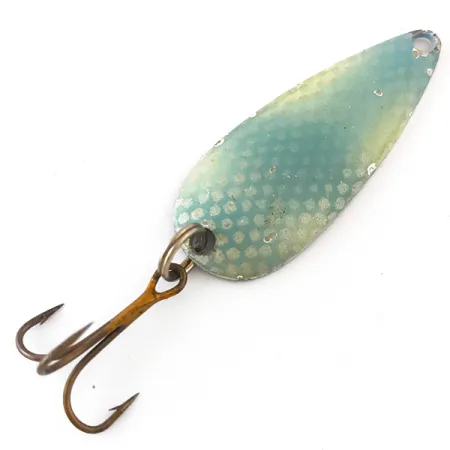 Een opvallend lichtblauw honingraat schubbenpatroon bedekt de bolle kant van deze klassieke lepel, een kenmerkende look van de Marathon Bait Company. Met een afmeting van 4,5 cm (1 3/4") en een gewicht van 5,5 g (3/16 oz) vertegenwoordigt dit exemplaar uit het midden van de vorige eeuw het hoogtepunt van de geschiedenis van kunstaasproductie in Wisconsin. Als je het kunstaas omdraait, zie je een strakke vernikkelde afwerking met de naam "MARATHON" in een elegante boog gestempeld, wat het identificeert als productcode 4161. Het bedrijf was gevestigd in Wausau, Wisconsin, van 1929 tot 1979, en stukken als deze laten zien waarom ze vijftig jaar lang een begrip bleven. Het beslag bevat een stevige splitring bevestigd aan een vintage dreg die lichte tekenen van ouderdom vertoont. De staat is beoordeeld als 4/5, waarbij de meeste originele verf en het reflecterende oppervlak behouden zijn gebleven. Het is ontworpen voor licht werpend vissen of trollen, waarbij de druppelvorm en gewichtsverdeling van de lepel ervoor zorgden dat deze diep in de waterkolom bleef.