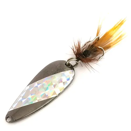 Met een gewicht van exact 1/4 oz (7 g) toont deze druppelvormige lepel een donkergrijze metallic afwerking, gecontrasteerd door een opvallende holografische inleg met diamantpatroon. Marathon Bait Company, gevestigd in Wisconsin van 1929 tot 1979, heeft hun naam duidelijk op de achterzijde van het 1 3/4" (4,5 cm) lange lichaam gestempeld. Dit kunstaas, bekend onder productcode 7529, is uitgerust met een haak voorzien van een goed geconserveerde versiering van bruine en gele veren. De conditie is uitstekend, beoordeeld op 5/5, wat de originele helderheid van de prismatische tape laat zien. Dit in de VS gemaakte exemplaar behoudt zijn originele hardware en fabrieksmatig gebonden hackle, wat de productienormen van die tijd weerspiegelt.