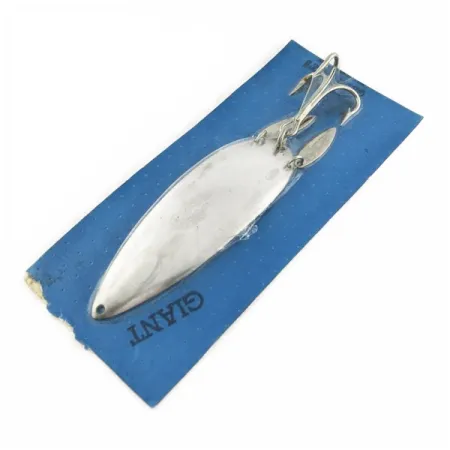De vernikkelde afwerking geeft deze 10 cm lange lepel een opvallende schittering die nog net zo helder is als toen deze de fabriek verliet. Met een gewicht van 21 g (3/4 oz) maakt dit exemplaar deel uit van de 'Giant'-serie van de Marathon Bait Company, die tijdens haar vijftigjarige bestaan van 1929 tot 1979 de titel van grootste kunstaasfabrikant van Wisconsin droeg. De ingestempelde letters 'GIANT' op de blauwe kartonnen verpakking bevestigen de identiteit en de catalogusplaatsing onder productcode 24088. Dit specifieke kunstaas is ongebruikt en zit nog op de originele kaart, wat het een bijzondere vondst maakt voor verzamelaars van halverwege de eeuwse Amerikaanse hengelsportartikelen. De constructie kenmerkt zich door een klassiek druppelvormig lepelprofiel, gecombineerd met een sterke dreg en een extra spinnerblad dat via een splitring aan de achterzijde is bevestigd. Al het metaalwerk is opvallend schoon, wat de kwaliteitsnormen van de Amerikaanse productie van Marathon weerspiegelt.