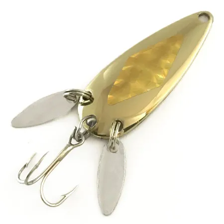 Een gefacetteerde sticker met diamantpatroon siert het midden van dit vergulde, druppelvormige lichaam van 4,5 cm (1 3/4"). Deze Marathon lepel weegt 8 g (1/4 oz) en is voorzien van de merknaam die direct in het metaal op de holle achterzijde is gestanst. Twee zilverkleurige, langwerpige mini-bladen zijn op splitringen bij de staart gemonteerd; deze "sonic blades" zijn ontworpen om de visuele illusie van de staartvinnen van een aasvis te creëren en de dreg te helpen verbergen. Dit exemplaar met productcode 6500 is afkomstig van de Marathon Bait Company in Wisconsin, VS. De gouden afwerking en het beslag verkeren in uitstekende staat, met een waardering van 5/5.
