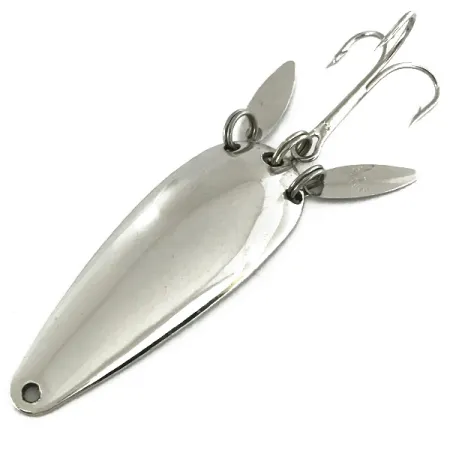 Gepolijst nikkel bedekt het volledige 6 cm (2 1/4") lange lichaam van deze vintage lepel, een kenmerk van het vakmanschap van de Marathon Bait Company tijdens haar vijftigjarige geschiedenis in Wisconsin. Met een gewicht van 12 g (2/5 oz) heeft dit kunstaas een unieke configuratie waarbij twee kleine, druppelvormige sonische bladen via splitringen bij de haak zijn bevestigd. Deze extra bladen dienen een dubbel doel: ze voegen extra schittering toe aan het profiel en maskeren gedeeltelijk de grote dreg om het uiterlijk van een vluchtende aasvis beter na te bootsen. Dit specifieke model, geïdentificeerd door productcode 7269, staat symbool voor de slimme techniek die Marathon tussen 1929 en 1979 tot een dominante Amerikaanse fabrikant maakte. De conditie is een solide 5/5, waarbij de metalen oppervlakken glanzend blijven en de gestempelde details scherp zijn. Een enkel, zuiver geboord bevestigingsoog aan het smalle uiteinde maakt het druppelontwerp compleet, bedoeld voor werpen of trollen in diverse zoetwateromstandigheden.