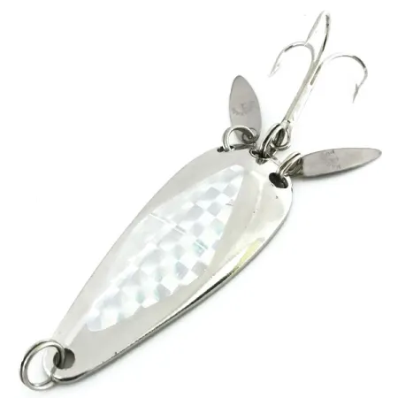 De vernikkelde oppervlakken van deze 6 cm (2 1/4") lepel zijn voorzien van een kenmerkend ruitpatroon aan de ene kant, contrasterend met de hoogglans afwerking van de achterkant. Afkomstig van de Marathon Bait Company uit Wisconsin — de grootste kunstaasfabrikant van de staat van 1929 tot 1979 — is dit exemplaar geïdentificeerd met productcode 8681. Twee langwerpige 'sonic' bladen zijn gemonteerd bij de achterste dreg, ontworpen om licht te vangen en visuele beweging te creëren die lijkt op de staart van een vluchtende aasvis, terwijl ze de haakpunt maskeren. Met een gewicht van 12 g (2/5 oz) is het kunstaas bewaard gebleven in 5/5 conditie. Het beslag blijft glanzend, wat de kwaliteit van deze Amerikaanse klassieker uit zijn vijftigjarige productiegeschiedenis onderstreept.