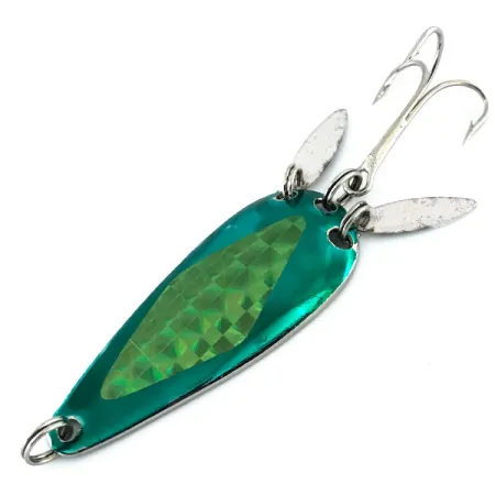 Twee zilveren 'sonic blades' in de vorm van een wilgenblad zijn gemonteerd aan de achterzijde van deze 6 cm (2 1/4") lepel, een kenmerkend ontwerpelement van de Marathon Bait Company. Dit 12g (2/5oz) kunstaas, bekend onder productcode 9023, heeft een opvallende groenblauwe voorkant met een ingelegde holografische strip met diamantpatroon. Dit specifieke exemplaar weerspiegelt de productietraditie van de in Wisconsin gevestigde firma die hengelsportartikelen produceerde van 1929 tot 1979. De achterzijde is afgewerkt met een glanzende vernikkeling en de algemene staat is beoordeeld als 5/5. Deze extra bladen zorgen voor een flikkerende schittering die de beweging van de staart van een prooivis simuleert en tegelijkertijd de dreg verbergt. De montage is nog steeds stevig, waarbij de originele splitringen de bladen en de haak aan het druppelvormige lichaam bevestigen.