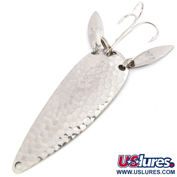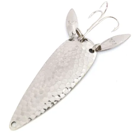 Gehamerd nikkel zorgt voor een opvallend lichtreflecterend oppervlak op deze lepel van 14 g (1/2 oz), geproduceerd door de Marathon Bait Company tijdens hun vijftigjarige bestaan in Wausau, Wisconsin. Met een lengte van 7,5 cm (3") is het lichaam uitgerust met twee extra "sonic blades" die aan de achterste splitring zijn bevestigd. Deze kleine, bladvormige metalen plaatjes zijn ontworpen om de grote dreg te maskeren en voor extra visuele schittering te zorgen, waarbij de beweging van staartvinnen wordt nagebootst. Zowel het hoofdlichaam als de extra bladen zijn voorzien van de gestempelde naam Marathon, een kenmerkend merkteken voor verzamelaars van Amerikaans hengelsportmateriaal uit het midden van de eeuw. Dit exemplaar, geïdentificeerd door productcode 9579, verkeert in prachtige staat met een score van 5/5 en behoudt een heldere en schone afwerking op het getextureerde metaal. Aan het taps toelopende vooreinde bevindt zich een enkel bevestigingsoog voor de montage, bedoeld voor zowel werpen als trollen.