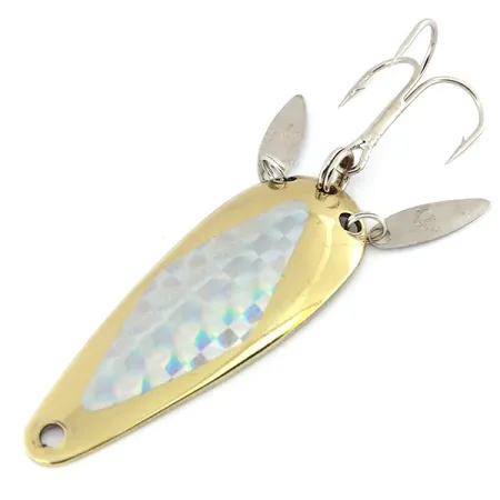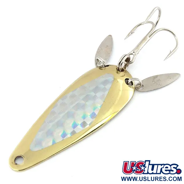 Deze lepel heeft een klassieke druppelvorm en een goudkleurig lichaam dat aan de bolle zijde is geaccentueerd met een levendig prismatisch schubbenpatroon. Op de holle achterzijde staat duidelijk de naam "MARATHON" gestempeld, een merk van de Marathon Bait Company die tussen 1929 en 1979 kunstaas produceerde in Wisconsin. Dit specifieke exemplaar, productcode 9680, is 6 cm (2 1/4") lang en weegt 12 g (2/5 oz). Twee kleine, vernikkelde sonische bladen zijn net boven de dreg bevestigd om extra lichtreflectie te creëren en de hardware visueel te camoufleren. Dit kunstaas verkeert in 5/5 conditie, met een onberispelijke afwerking op zowel het vergulde lichaam als de extra bladen.
