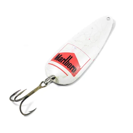 Een klassiek profiel van 7 cm kenmerkt deze gestanste metalen lepel, die dient als uniek hengelsport-memorabilia met een knipoog naar tabak. Dit item, oorspronkelijk geproduceerd in de USA met productcode 1964, heeft een wit parelmoer-afwerking aan de bolle zijde die wordt gedomineerd door het iconische rode Marlboro-logo. De achterkant onthult een contrasterende vernikkeling, wat zorgt voor de nodige schittering die verwacht mag worden van een traditioneel lepelontwerp. Met een gewicht van 16 g is de bouw stevig genoeg voor diverse werp- of trolltoepassingen. De montage bestaat uit een vintage dreg die is bevestigd met een stevige splitring aan de staart. Het kunstaas verkeert in een 3/5 conditie en vertoont authentieke slijtage op de verf en het metaal, wat de geschiedenis aan het water benadrukt. Een enkel bevestigingspunt aan de kop maakt eenvoudige montage aan de lijn of leader mogelijk.