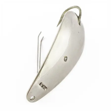 De verzilverde afwerking accentueert het slanke profiel van deze 5,5 cm (2 1/4") Master Weedless Lotta Junior. Deze in de VS geproduceerde lepel heeft een body van dik metaal met een enkele geïntegreerde haak, speciaal ontworpen voor het vissen in dichte begroeiing. Om vastlopers te voorkomen, is de haakbasis voorzien van twee veerkrachtige metalen wierbeschermers die tot aan de haakpunt reiken. Dit exemplaar, met productcode 24158, heeft een glanzend en goed bewaard gebleven oppervlak, wat past bij de conditiescore van 5/5. Aan de voorzijde zorgt een strak geboord oog voor een directe lijnbevestiging of de montage van een wartel. Dankzij het gewicht van 12 gram (2/5oz) heeft de lepel voldoende massa om verre worpen te maken. Een kleine klinknagel en de gestempelde markeringen op de body getuigen van de halverwege de vorige eeuw gebruikte productietechnieken van het merk Master.
