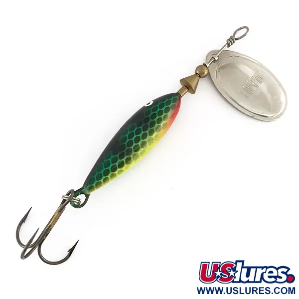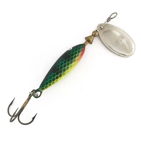Een levendig groen honingraatschubpatroon met gele en zwarte accenten kenmerkt het verzwaarde lichaam van deze Matzuo FinSpin, aangeduid met productcode 7894. Met een lengte van 8,25 cm (3 1/4") is het ontwerp voorzien van een gepolijst zilverkleurig spinnerblad in de vorm van een wilgenblad, gestempeld met de modelnaam en gemonteerd op een beugel voor rotatie. Met een gewicht van 7g (1/4oz) is de spinner gebouwd op een stevige metalen as met koperkleurige afstandhouders en een bevestigingsoog aan de bovenzijde. De gelakte afwerking is haarscherp met een duidelijke definitie van het oogdetail, wat een conditiescore van 5/5 oplevert. De focus van Matzuo op realistische texturen is duidelijk zichtbaar in de diepte van het schubbenpatroon, dat een aanvulling vormt op de reflecterende metalen onderdelen en de scherpe dreg die via een splitring is bevestigd.