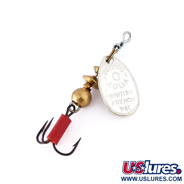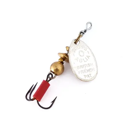 De stempeling op het zilveren blad onthult de originele markeringen "British French Pat." en "Aglia", een directe link naar de uitvinding van Andre Meulnart uit 1938. Dit exemplaar in maat 0 weegt 2,5 g (3/32 oz) en is 4,5 cm (1 3/4") lang, wat het een perfecte keuze maakt voor ultra-light vissen. Op de achterzijde is het blad duidelijk gemarkeerd met "Made in France", terwijl de spinner in de VS is geassembleerd. Het centrale lichaam is voorzien van een reeks messing kralen en een verzwaarde basis die stabiliteit biedt aan het op een beugel gemonteerde rotatiesysteem. Een opvallend detail is de dreg, die is uitgerust met een kenmerkende rode plastic huls die dient als visueel richtpunt voor forel of baars. In 5/5 conditie is de zilveren afwerking uitzonderlijk helder en blijft het messing beslag schoon, wat duidt op een zorgvuldige bewaring. De metalen as is strak om het oog gewikkeld, wat de duurzame afwerking toont die verwacht mag worden van productcode 10339. Het brede bladprofiel is ontworpen om direct te roteren bij het binnenvissen, waardoor de mechanische weerstand ontstaat die nodig is om de spinner op verschillende waterdieptes te laten functioneren.