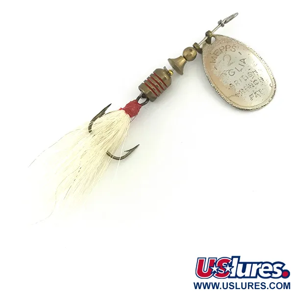 Het zilveren blad, gestempeld met het 'MEPPS 2 AGLIA' keurmerk en Britse en Franse patentreferenties, weerspiegelt het erfgoed van Andre Meulnarts ontwerp uit 1938. Met een gewicht van 4,7 g (3/16 oz) en een totale lengte van 5,5 cm, is dit exemplaar voorzien van een messing body waar het centrale gewicht wordt geaccentueerd door vier verzonken rode ringen. Het actieve gedeelte bestaat uit een dreg versierd met wit bucktail, gebonden met een kenmerkende rode draad bij de kraag. Componenten voor deze spinner werden vervaardigd in Frankrijk en geassembleerd in de VS, een gebruik dat de aanwezigheid van het merk op de Amerikaanse markt in het midden van de 20e eeuw verstevigde. Geclassificeerd onder productcode 7292, is het kunstaas in 5/5 conditie, met een glanzende afwerking op het blad en intacte haardressing. Het brede blad is ontworpen voor onmiddellijke rotatie bij contact met het water, een technisch kenmerk van de Aglia-serie.