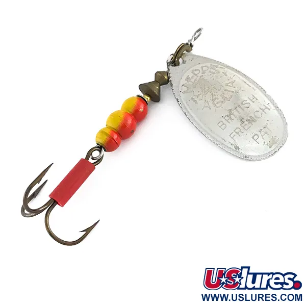 Duidelijk in het zilveren blad gestanst staan de kenmerken van zijn erfgoed, die dit specifieke exemplaar identificeren als een "British French Pat" model. Deze Mepps Aglia 4, gecatalogiseerd onder productcode 8085, meet 7 cm (2 3/4") en weegt 9 g (1/3 oz). De constructie bevat een opeenvolging van drie gele en rode kralen boven een dreg die wordt beschermd door een segment rode slang. De hardware is in 5/5 conditie, met een glanzende afwerking op het blad en scherpe haakpunten. Op de achterkant van het blad geeft de stempel "Made in France" de oorsprong aan van de componenten, die later voor de Amerikaanse markt werden geassembleerd. De messingkleurige afstandhouders en het kegelvormige rotatiesysteem zijn ontworpen om de beweging van het blad te vergemakkelijken op het moment dat het de waterkolom binnendringt. De draadas is recht en het geheel toont de nauwkeurige zorg tijdens de fabricage.