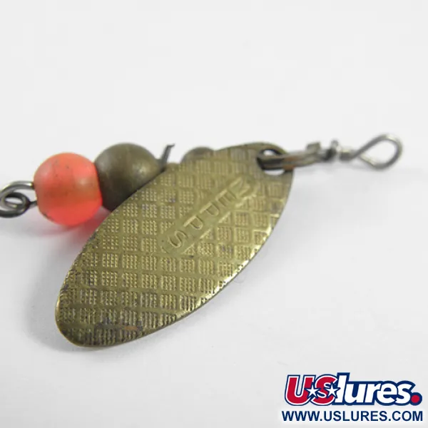 Het kenmerkende langwerpige wilgenblad van deze spinner in maat 0 is voorzien van een getextureerde messing afwerking die zorgt voor een subtiele schittering tijdens het binnenhalen. Met een gewicht van 2,6 g (3/32 oz) en een totale lengte van 5 cm (2"), vertegenwoordigt deze Mepps Aglia Long (artikelcode 1784) een klassiek ontwerp met hoogwaardige componenten gemaakt in Frankrijk en geassembleerd in de VS. De opbouw bestaat uit een feloranje kunststof kraal gevolgd door drie messingkleurige metalen kralen, die fungeren als het primaire gewicht op het draadframe. Het messing blad is gestempeld met het merk van de fabrikant, wat de vintage authenticiteit garandeert voor de verzamelaar of sportvisser. Met een conditiescore van 4/5 vertoont de spinner lichte gebruikssporen, maar de hardware is schoon en de dreg is scherp.
