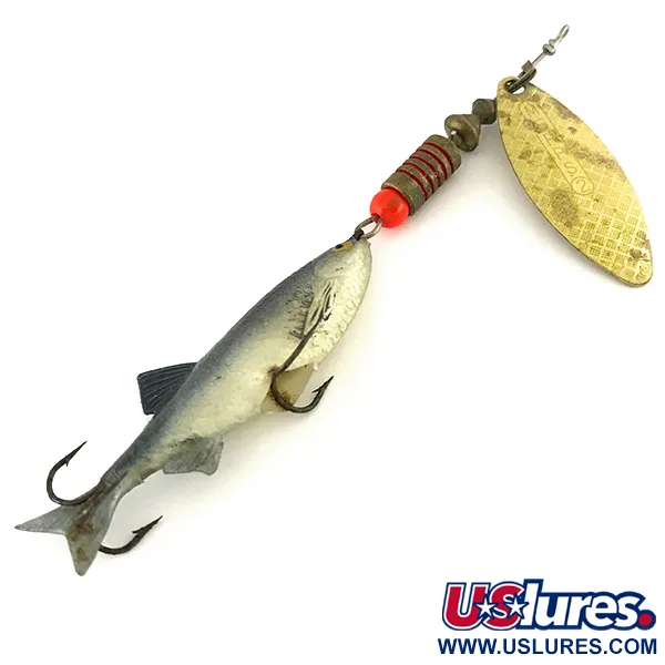 Messing afwerkingen op het wilgenblad-spinnerblad vangen het licht met een kenmerkend diamantpatroon met textuur. De gestempelde markering "AGLIA LONG 2 MADE IN FRANCE" op het blad weerspiegelt de historische samenwerking waarbij in Frankrijk gemaakte componenten in de VS werden geassembleerd. Met een totale lengte van 11 cm is de kunstlure voorzien van een zachte kunststof minnow-body, gedetailleerd met een realistisch blauw-zilver verloop. Dit exemplaar, geïdentificeerd door productcode 7563, heeft een gewicht van 9 g en is opgebouwd rond een messingkleurig gewicht met dieprode groeven en een felrode kraal. Drie haken zijn strategisch geplaatst langs het visprofiel en komen tevoorschijn uit de rug-, buik- en staartsecties. Met een conditiebeoordeling van 4/5 blijven de hardware en de softbody goed bewaard, met slechts de kleinste tekenen van tijd doorgebracht in een verzameling.