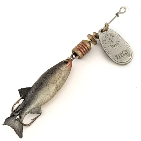 Gestempeld met het nummer 1 en de naam Comet, is het zilveren blad van deze montage een klassiek Frans onderdeel gecombineerd met een realistische zachte kunstaasvis. Gecatalogiseerd onder code 13127, weegt deze Mepps Comet Mino 1 4,6 g (3/16 oz) und is het een essentieel item voor verzamelaars van licht materiaal. Het zilverkleurige blad draait op een stevige metaaldraad die leidt naar een verzwaard messing lichaam met drie duidelijke rode groeven. Met een lengte van 8 cm (3 1/4") van het vooroog tot de staart, heeft het kunstaas een visje met een donkere, geschubde rug en een bleke buik met een vleugje rood bij de keel. Deze componenten, geassembleerd in de VS met originele Franse onderdelen, verkeren in uitstekende staat, wat blijkt uit een 5/5 beoordeling voor zowel het metaal als het zachte plastic. Een enkele dreg is geïntegreerd aan de achterzijde van het visprofiel om een gestroomlijnd silhouet te behouden.
