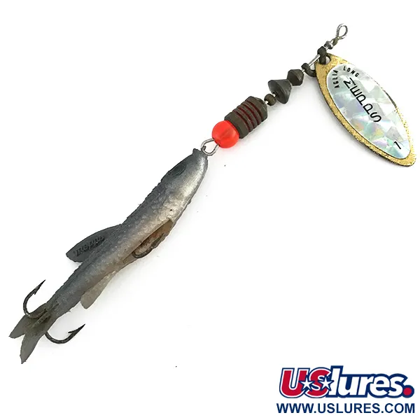 Met een gewicht van 7 g (1/4 oz) benadrukt deze klassieke inline spinner-setup de historische samenwerking tussen Franse componenten en Amerikaanse assemblage. Het zilveren blad is voorzien van een getextureerde holografische sticker die ontworpen is om licht te vangen, duidelijk gestempeld met de naam Mepps. Met een lengte van 9 cm (3 1/2") combineert de assemblage een traditioneel spinnerblad met een realistisch zacht plastic minnow-lichaam. Een levendige rode kraal vormt een brandpunt nabij de voorkant van het aasvisprofiel, gevolgd door een reeks geribbelde zwarte afstandhouders. Het zachte visje is uitgerust met een dreg aan de staart en een interne haak om zijn vorm te behouden. Met productcode 8483 verkeert dit exemplaar in uitstekende staat, gewaardeerd met 5/5, wat de schone integriteit van het zachte lichaam en de glans van het metaalwerk laat zien. De achterkant van het blad onthult de kwaliteit van de in Frankrijk gemaakte componenten, een kenmerk van de productie van het merk uit dit tijdperk.