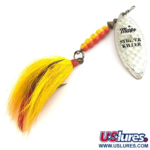 Met een aanzienlijk gewicht van 30 g (1 oz) is deze in Frankrijk gemaakte spinner voorzien van een groot zilveren blad met daarop de aanduidingen 'Mepps Striper Killer' en 'Giant Killer' gestempeld. Een reeks felgele en rode kralen vormt het gesegmenteerde lichaam, dat uitloopt in een zwaar bevederde dreg met gele veren en een vleugje rood aan de basis. Dit specifieke exemplaar, geïdentificeerd door productcode 7434, heeft een totale lengte van 12 cm (4 3/4") en verkeert in uitstekende staat (5/5). De achterzijde van het blad toont duidelijk het 'Made in France' kenmerk en de 'Giant Killer' branding, wat de traditie weerspiegelt van een van 's werelds meest erkende hengelsportfabrikanten. Ontworpen voor het vissen op grotere roofvissen in dieper water, zorgen de zware constructie en de bevederde staart voor een flink profiel zonder dat dit ten koste gaat van de werpafstand. De integriteit van het metalen frame en de zuiverheid van de zilveren afwerking maken dit een hoogwaardig voorbeeld van klassieke Mepps-productie.