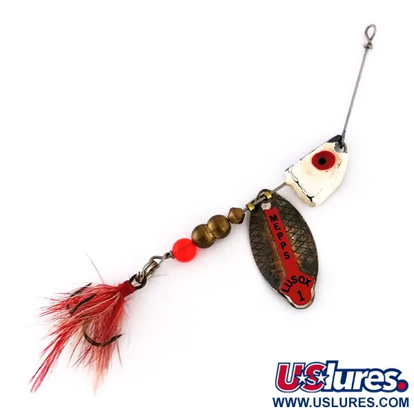 Een messingkleurig spinnerblad met een opvallende rode sticker en 'MEPPS LUSOX 1' belettering kenmerkt dit in de VS gemaakte exemplaar. Met een lengte van 7,5 cm (3") en een gewicht van 10 g (1/3 oz) is de constructie opgebouwd rond een stevige metalen as. De montage bevat een verzwaarde loodkop afgewerkt in wit en zwart met een duidelijk rood oog, gevolgd door drie messing kralen en een feloranje afstandskraal. Aan de achterzijde is een rode dreg met veren bevestigd, wat een zacht visueel element toevoegt aan het metalen profiel. Met een conditiescore van 4/5 zijn de geverfde accenten en metalen oppervlakken goed bewaard gebleven, met slechts lichte tekenen van ouderdom. Dit model, bekend onder productcode 10198, maakt gebruik van het klassieke wisselkop-systeem van de Lusox-serie, ontworpen voor presentaties op verschillende waterdieptes.