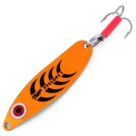 De gebogen body van deze lepel is afgewerkt in een feloranje kleur en voorzien van contrastrijke zwarte markeringen die overgaan in een gespecialiseerde UV-reflecterende gloed voor zichtbaarheid in diep of troebel water. Met een gewicht van 12g (2/5oz) en een lengte van 6cm (2 1/4") verkeert de Mepps Syclops 1 (Productcode 10305) in 5/5 conditie en lijkt ongebruikt. Een opvallend rood-wit oog bevindt zich bij het oog van de lepel en biedt een duidelijk richtpunt voor roofvissen. De hardware bestaat uit een robuuste splitring en een dreg voorzien van een rood slangetje, een kenmerkend Mepps-detail dat op veel van hun in Amerika gemaakte kunstaas te vinden is. Tien verschillende reflectievlakken zijn in de metalen body gestanst om ervoor te zorgen dat het licht tijdens het binnenvissen vanuit meerdere hoeken wordt weerkaatst.