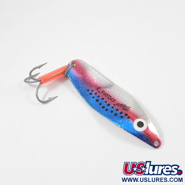 Deze Mepps Syclops 3 heeft een body van 26g met een Franse oorsprong aan de achterzijde gestanst en toont een klassiek S-profiel voor verre worpen in diep water. Het Rainbow Trout / Silver kleurenschema op de buitenkant loopt over van een roze zijlijn naar een blauw-gespikkelde bovenkant, geplaatst tegen een reflecterende zilveren basis met een opvallend oog bij de neus. Met een lengte van 9 cm (3 1/2") is de lepel voorzien van duidelijke gravures op de holle zijde die de massa van 26g en de modelnaam aangeven. Een duurzame dreg is bevestigd via een zware splitring en bevat de kenmerkende roodoranje attractor tube over de steel. Dit exemplaar met productcode 1947 verkeert in 5/5 conditie, met een schone afwerking van de metalen oppervlakken en originele hardware.